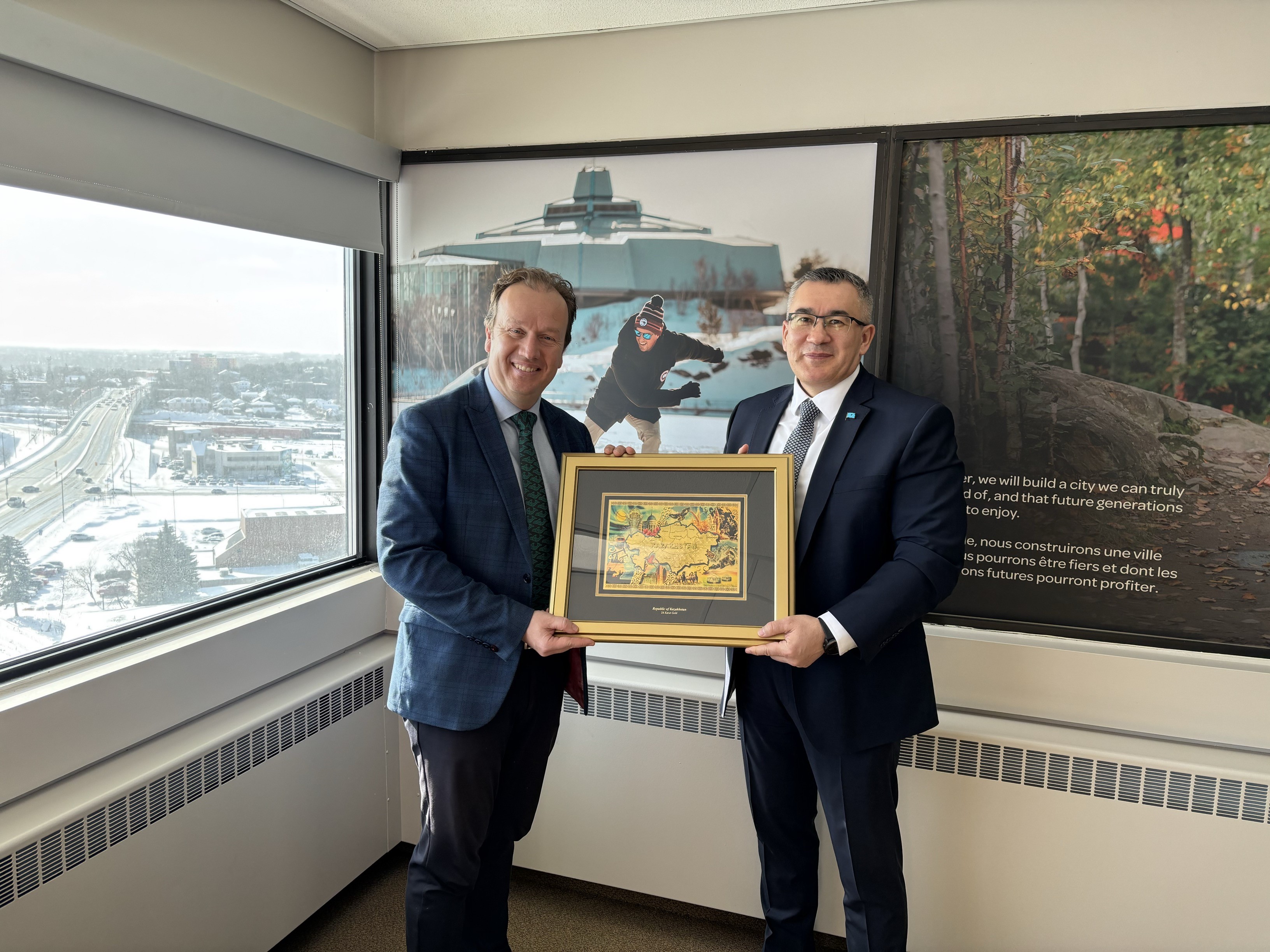 Greater Sudbury Mayor Paul Lefebvre had the honour of meeting with Ambassador Kussainov, where they exchanged meaningful gifts from their respective regions. Mayor Lefebvre presented a copy of the book 102 Things to Do with a Hole in the Ground, co-written by Peter Whitbread-Abrutat and Robert Lowe, which highlights the world-renowned Sudbury Regreening Story. In return, Ambassador Kussainov gifted Greater Sudbury a stunning piece of artwork depicting Kazakhstan's landmarks in 24 karat gold.