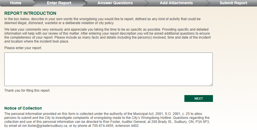 The Wrongdoing Hotline is a confidential and anonymous service currently overseen by the CAO’s office. Everyone may use this service, including citizens, municipal employees and municipal contractors, seven days a week and 24 hours a day to report suspicion or proof of wrongdoing, defined as any kind of activity that could be deemed illegal, dishonest, wasteful or a deliberate violation of city policy. Submit a secure form online at www.sudburycomplaints.ca.