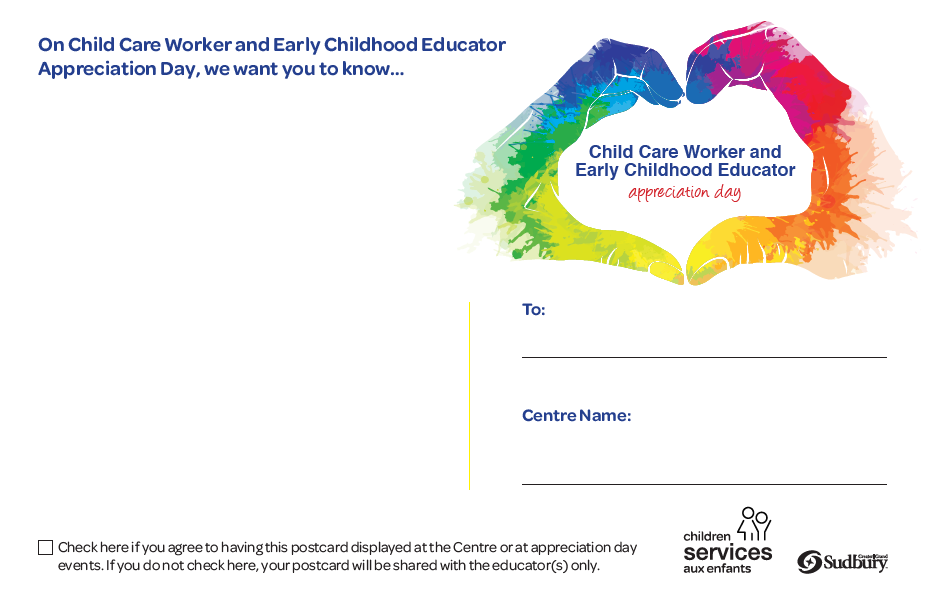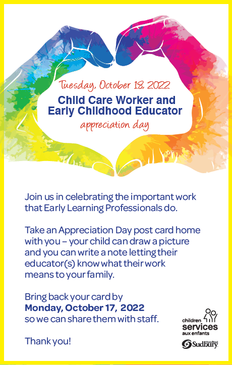 Licensed Child Care and EarlyON Programs across Greater Sudbury participated in a Lawn Sign and Postcard Campaign, designed to let families know about ECE and Child Care Worker Appreciation Day, and express their thanks to the professionals that work with their children.