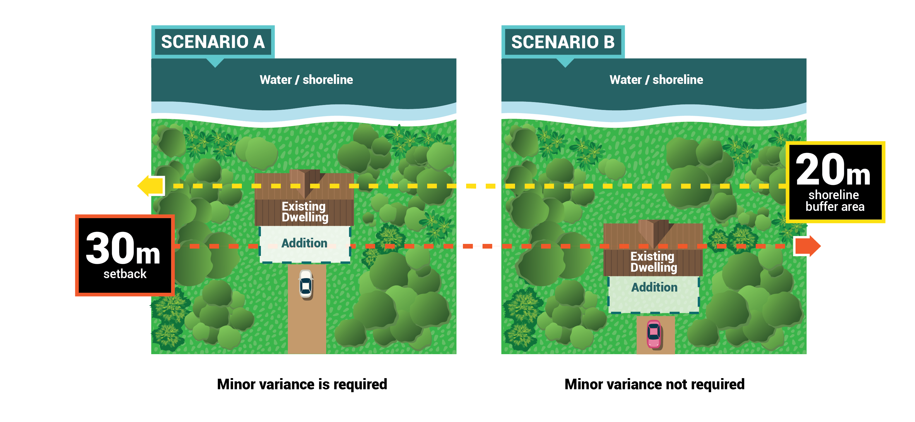 The Zoning By-law contains provisions that allow for reconstruction, enlargement, repair and renovation. In certain instances a minor variance may be required, in other instances it may not. If your camp or dwelling is located within the required setback AND the addition is partially or wholly within the setback a minor variance will be required. Proposals will be evaluated on a case-by-case basis by staff, and recommendation for approval may depend on site characteristics, such as size and layout (example, irregularly shaped lot), whether constraints exist that prevent building in compliance with the zoning by-law, etc.