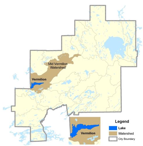 Vermilion Lake is located in the Mid-Vermilion Watershed. The drainage basins' topography is characterized by rugged Precambrian terrain, which covers an area of about 2850 km2. 778 km2 are in the Onaping River watershed below the influence of Bannerman Creek, while the remainder is in the Vermilion River watershed.