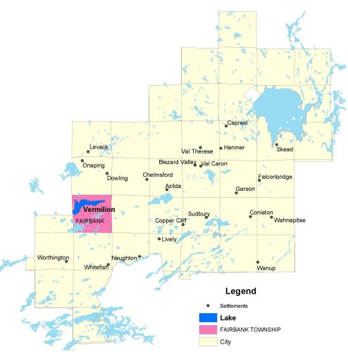 Vermilion Lake is located in Fairbank Township, approximately 33 kilometres west of downtown Sudbury.
